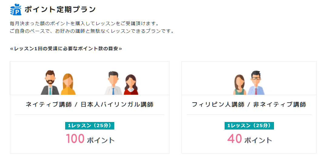 ネイティブ講師はだいたい50~125ポイント、フィリピン人講師は40~60ポイント、日本人講師は100ポイントというのが平均的なポイントです。